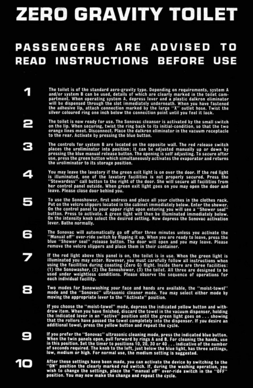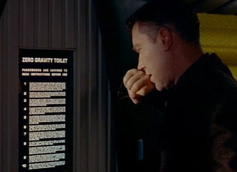 The shuttle sequence also has the only joke in the whole film. Floyd goes to the toilet and we see him read extremely complicated instructions on how to use the zero-gravity toilet.