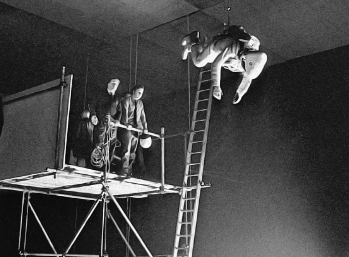 One of the biggest costs was the revolving set created for the anti-gravity scenes. It was 40ft in diameter and built by aeroplane manufacturer Vickers Armstrong for $750k. Cameras were attached to a dolly to follow the actors, or to the set to follow the centrifuge.