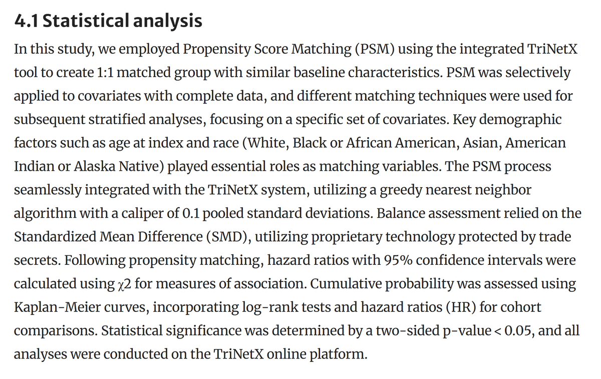 Turning back to the infection-cancer article.... The article's statistical analysis section is extremely short. They don't go into any of the issues I am raising. An observational epi paper should be analytically intensive. It's rare to see such an underdeveloped analytic section (and analyses) even in papers that are not analytically challenging. You'll notice some of this section appears to be AI written or AI massaged; it could just be through Grammarly or to assist with grammar more generally (I don't personally find that offensive, just a red flag that they might not know what they're doing anlytically), but as an example, there are phrases no scientist would really use, like "The PSM process was *seamlessly integrated*... using proprietary technology protect by trade secrets." It describes the analyses in ways that are direct, superficial, and insufficient for conveying what was done.