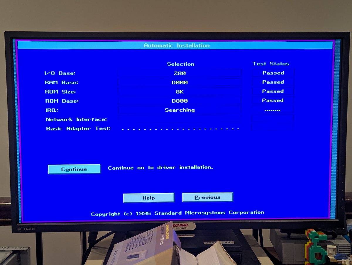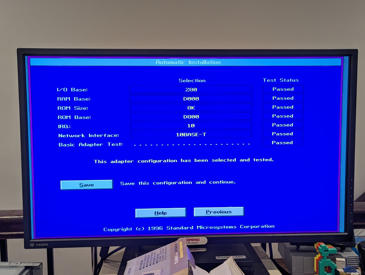 Okay, so I got this SMC Ethercard Elite 8216T (say that five times fast) installed in my Pentium 233 MMX. I was able to pull up the boot ROM configuration page, but savings settings would freeze. That would be a bit of a metaphor for this card...