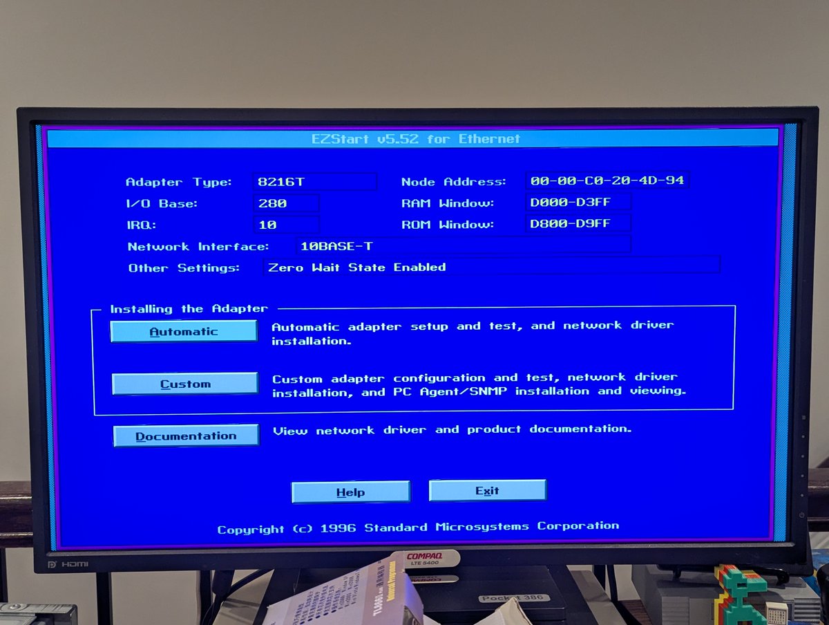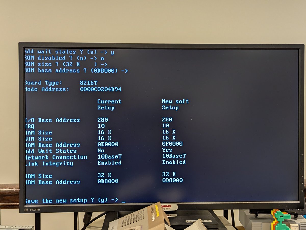 So, with the option ROM flaky and the NE2000 card now dead, I just assume leave this SMC card in the system and reload. I moved my XTIDE option ROM to this card for large disk support as well, installed a 4GB hard drive, and used LAN Manager to copy over files.