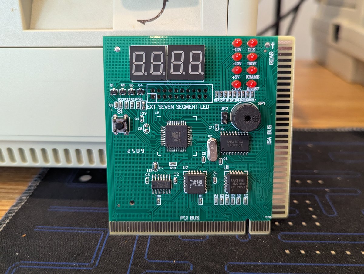 In case you missed it, I recently got a device to display BIOS diagnostic codes on powerup, and we learned that the system was getting stuck when it was testing the keyboard controller: