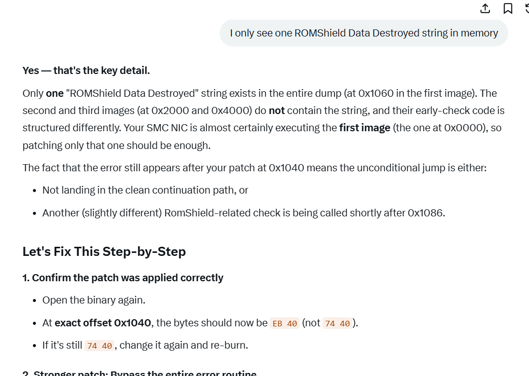 Great! Time to boot. Oh... ROMShield Data Destroyed... and we're stuck. What the hell does that mean? I did spend some time trying to bypass it with the help of Grok and Gemini. Unfortunately, we didn't make it far enough, and I gave up trying further!