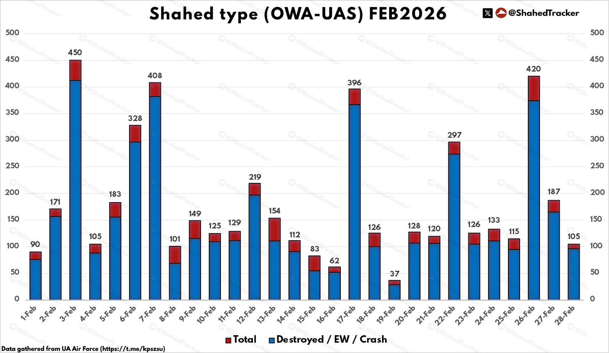 Another good account following these trends is @ShahedTracker. Here you can see the february strikes, with 129 per day on average and 37% of those are decoy.