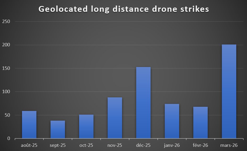 The number of geolocated long range strikes has increased in march, and this mainly counts strikes filmed by the drones themselves.