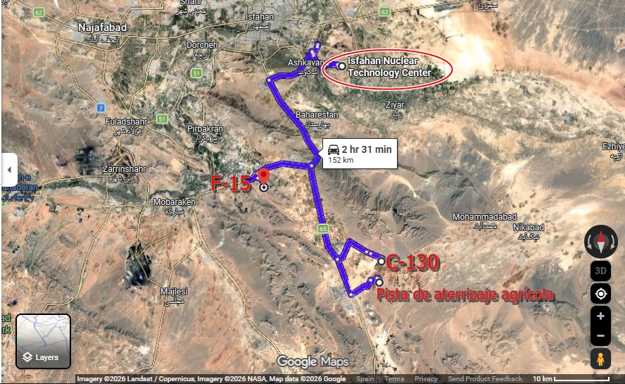Isfahan Nuclear Technology Center — el objetivo real, a ~35 km en línea recta
