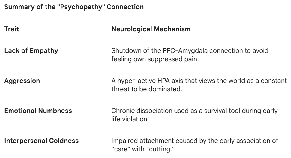 The Amygdala Hijack: Early trauma prioritizes the development of the amygdala (the fear center) over the PFC. If an infant is subjected to a ritualized violation, the brain learns that the world is a place where "might makes right."