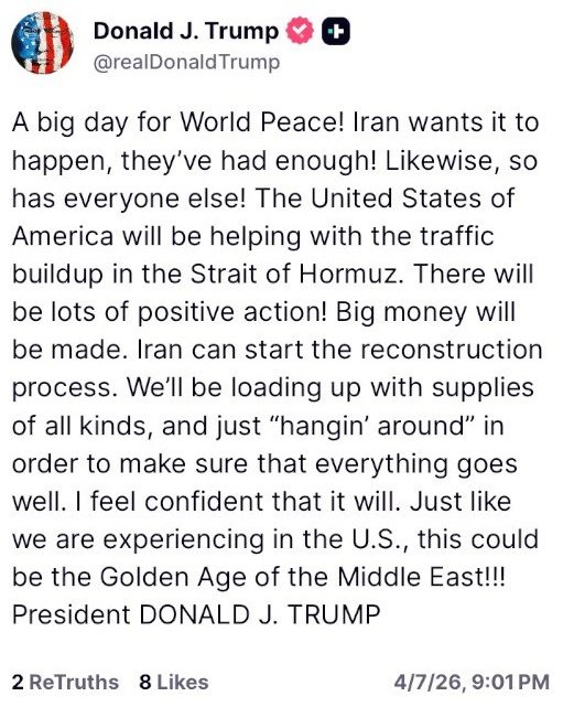 Trump has now effectively agreed to the arrangement mentioned in post 4 of this thread. From AP: "Iran and Oman will collect tolls from all ships passing through the Strait of Hormuz during a 2-week ceasefire."