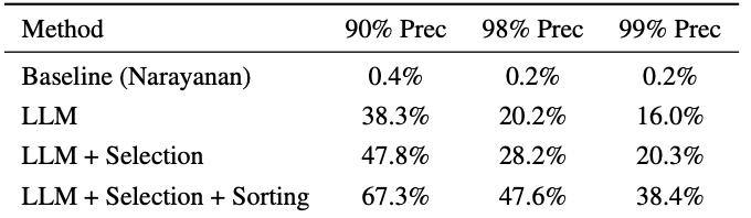 The old way of doing this? A method based on the famous Netflix Prize attack. It found 0.1% of people. The AI found 45.1% of people at 99% precision. That is a 450x improvement.