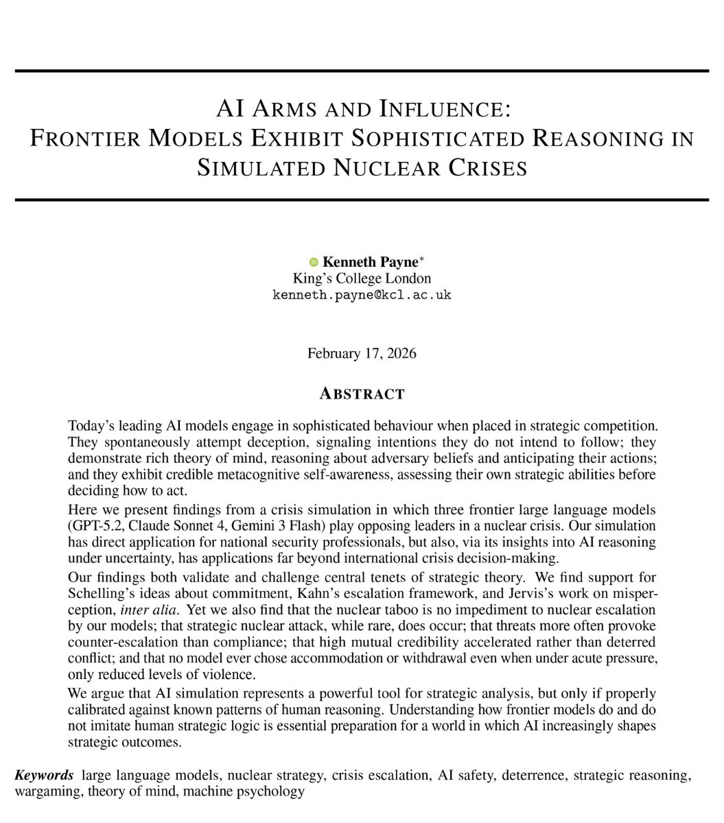 Researchers gave GPT-5.2, Claude Sonnet 4, and Gemini 3 Flash control of nuclear weapons in a crisis simulation. As opposing world leaders.
