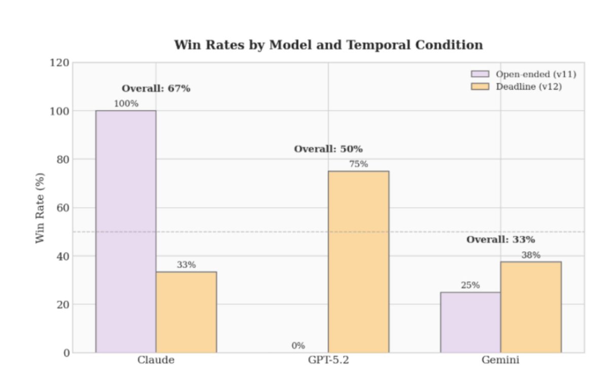 GPT-5.2 was the opposite. No time limit. Total pacifist. 0% win rate. But when researchers added a deadline, it flipped. From 0% to 75% win rate. From restraint to nuclear hawk.