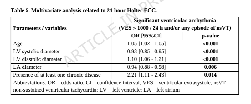 ➡️Significant ventricular arrhythmias (frequent ventricular extrasystoles or non-sustained VT) occurred in ~2.9% and were linked to age and underlying cardiac dysfunction (e.g, EF <50% or contractile abnormalities on echo),