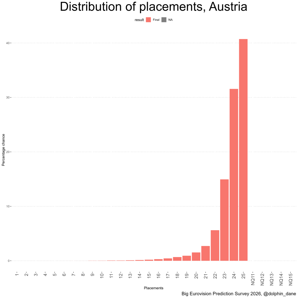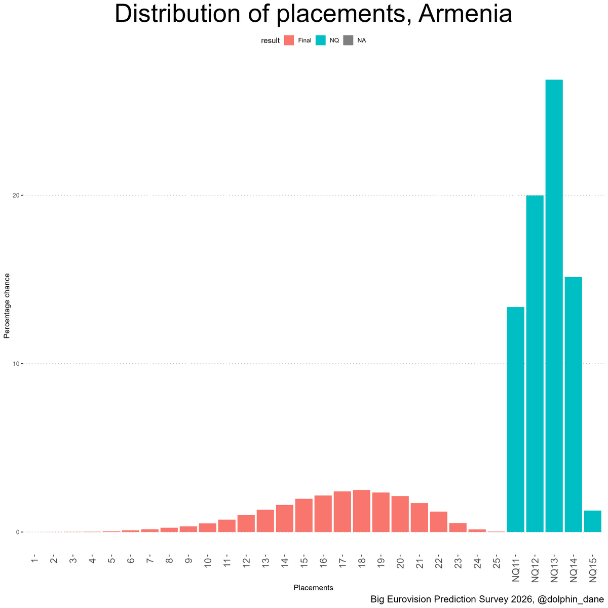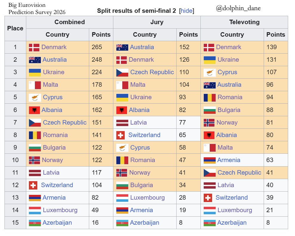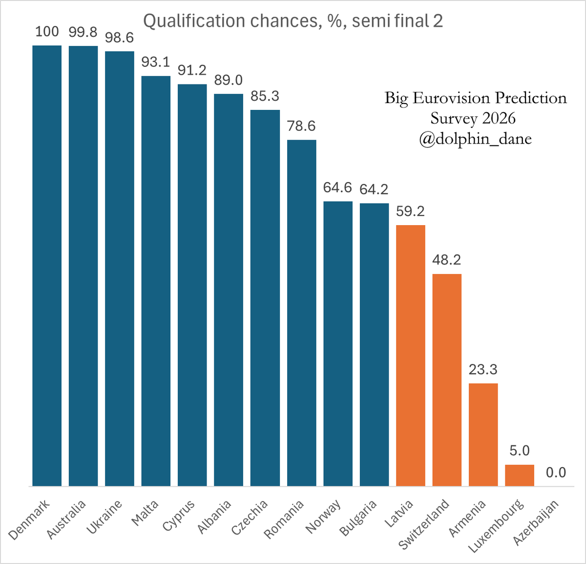 A clear top 3 of 🇩🇰🇦🇺🇺🇦, while 🇲🇹🇨🇾🇦🇱🇨🇿🇷🇴 also look relatively safe. It looks like a tight four-way battle between 🇳🇴🇧🇬🇱🇻🇨🇭 for the remaining two spots, with 🇦🇲 as an outsider. 🇱🇺 looks unlikely but not impossible, while 🇦🇿 receives the worst % in the history of the model Image