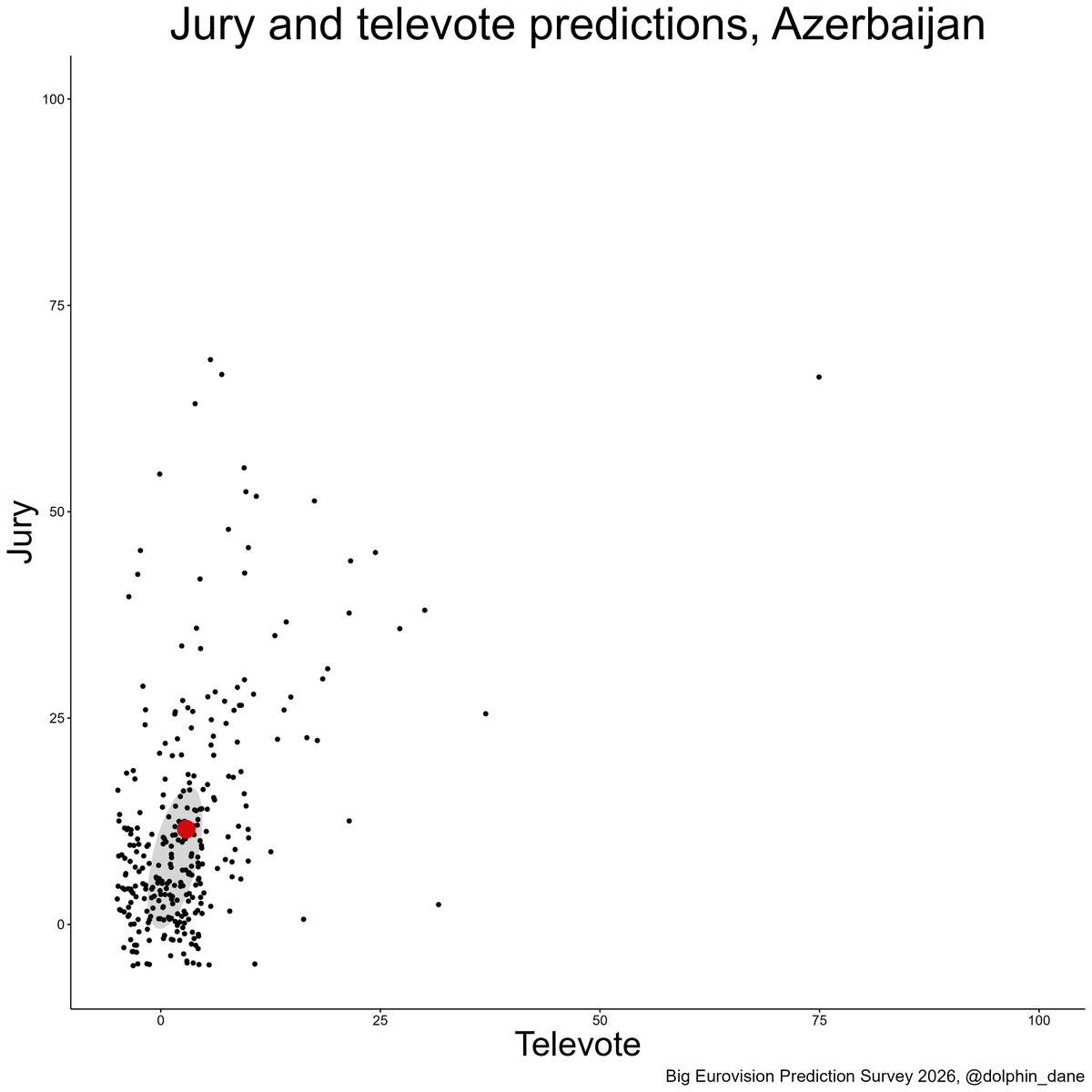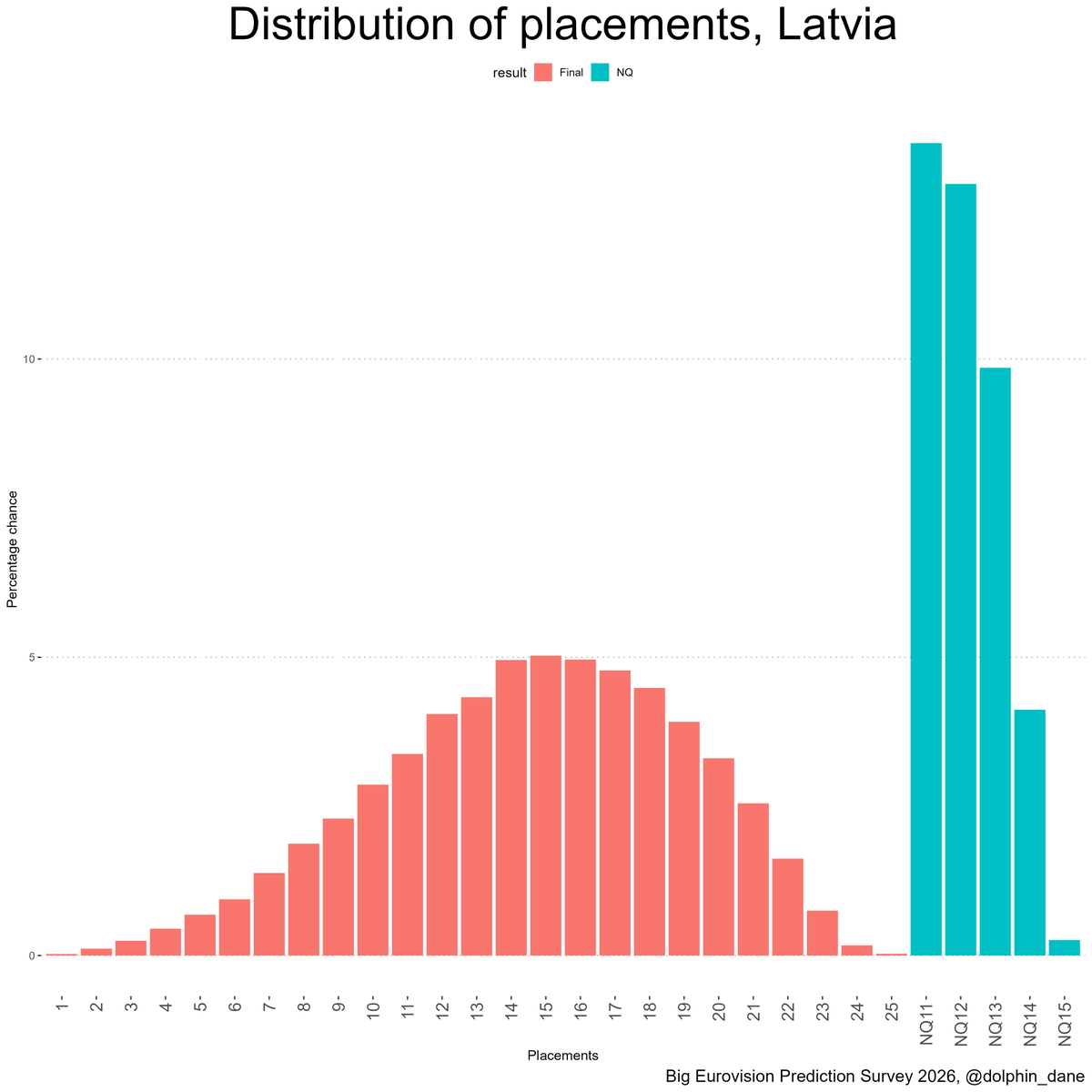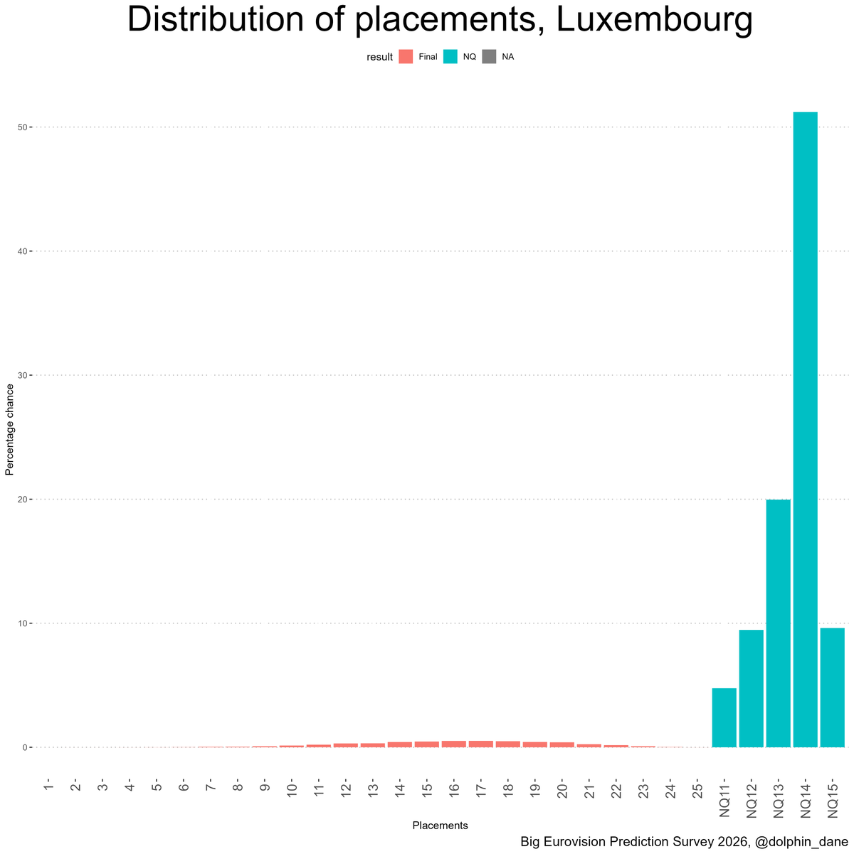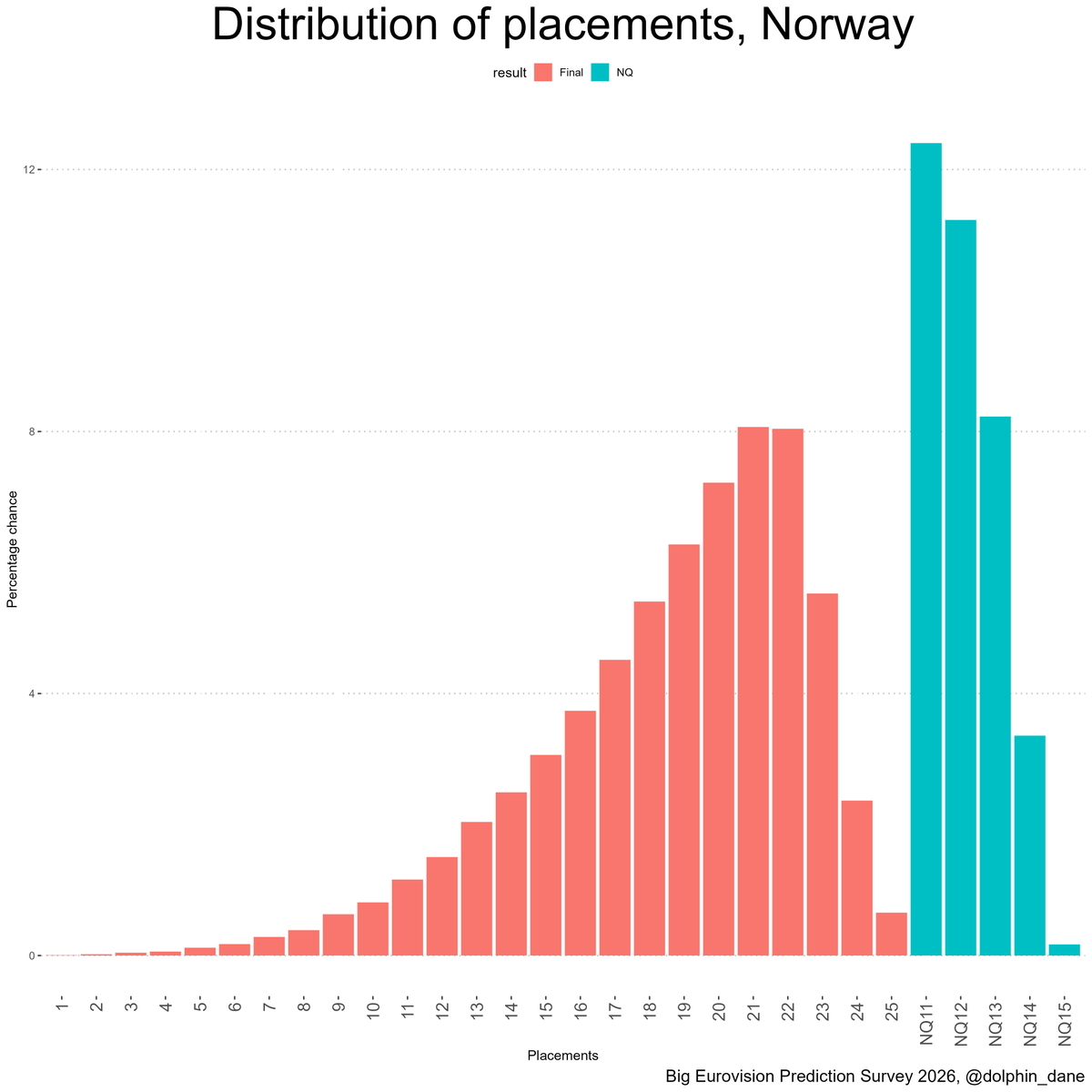 A clear top 3 of 🇩🇰🇦🇺🇺🇦, while 🇲🇹🇨🇾🇦🇱🇨🇿🇷🇴 also look relatively safe. It looks like a tight four-way battle between 🇳🇴🇧🇬🇱🇻🇨🇭 for the remaining two spots, with 🇦🇲 as an outsider. 🇱🇺 looks unlikely but not impossible, while 🇦🇿 receives the worst % in the history of the model Image