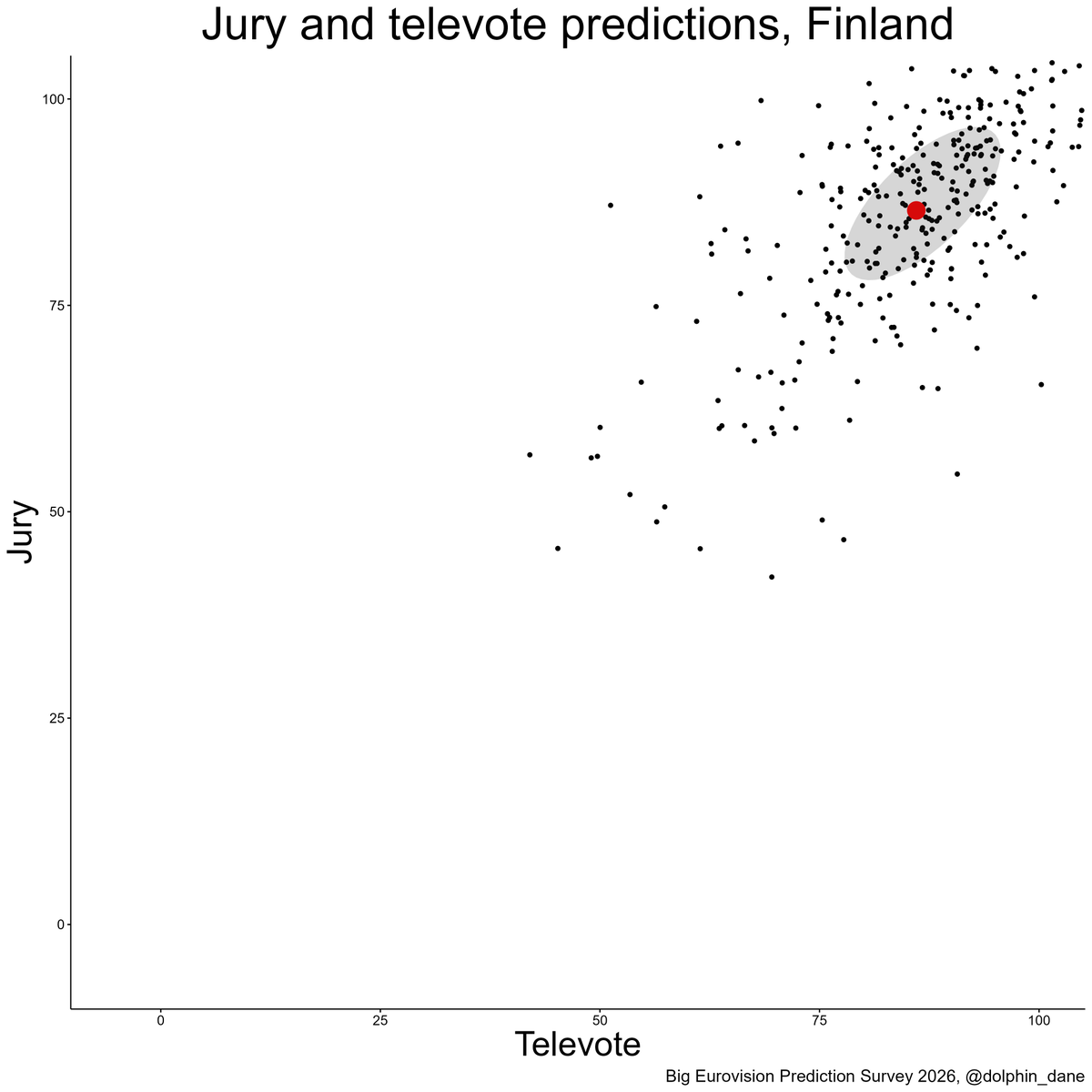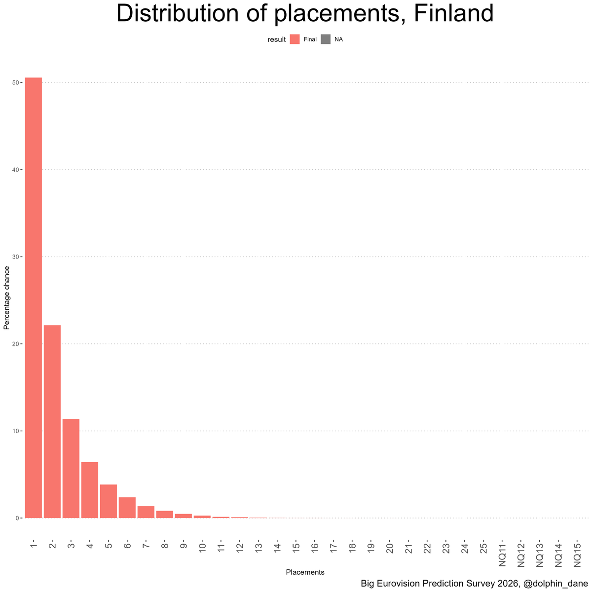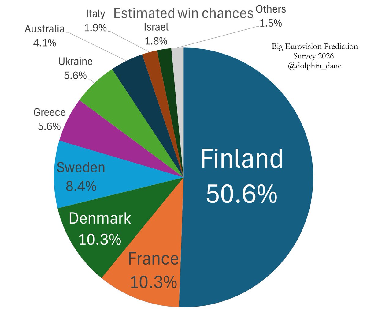 A clear frontrunner, with 🇫🇮 looking like the only country contending for the win in both categories. 🇫🇷🇦🇺 could use a jury win as a springboard, while 🇬🇷🇮🇱 would rely on strong televote showings. 🇩🇰🇸🇪🇺🇦🇮🇹 look like potential compromise winners, if others fail Image