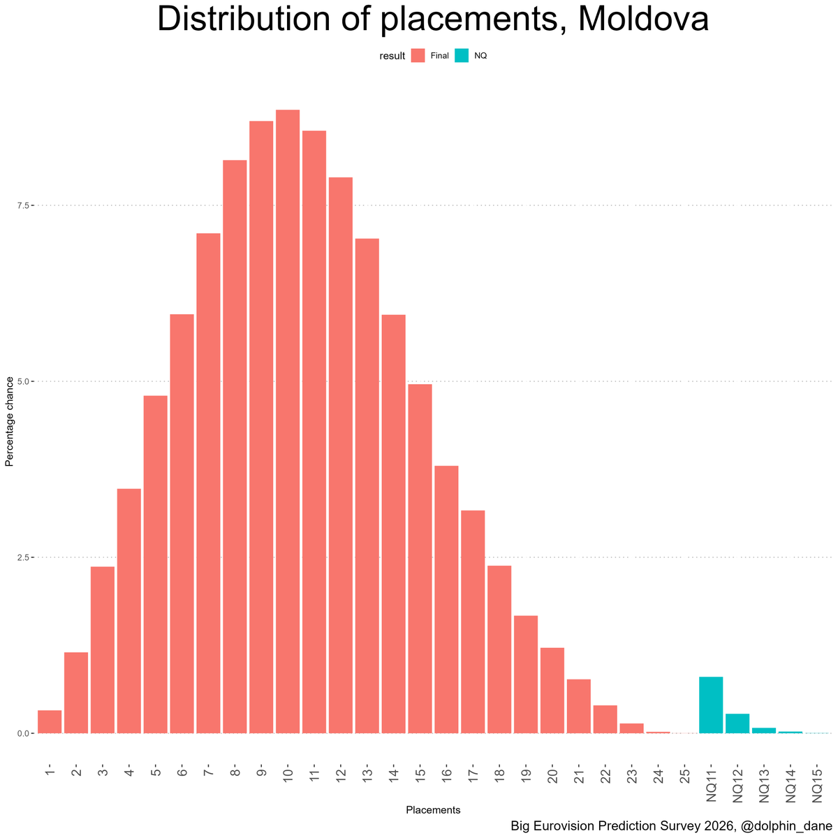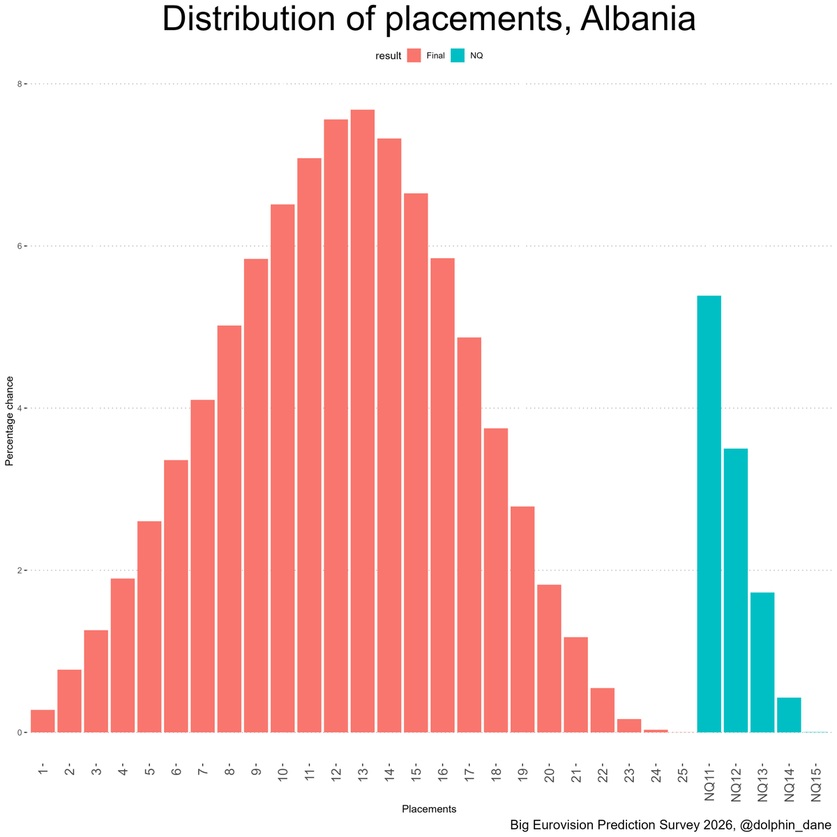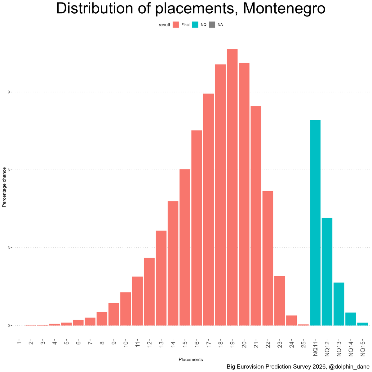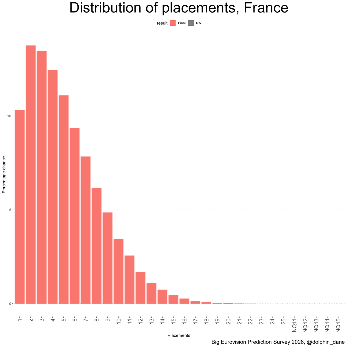 Let us now move on to a detailed country by country forecast. For each country I will show you the predictions that fed the model, as well as the distribution of placements for the entry in the 100000 simulations Image