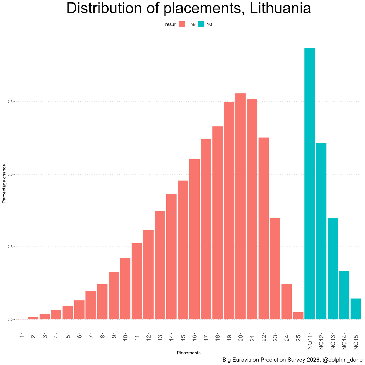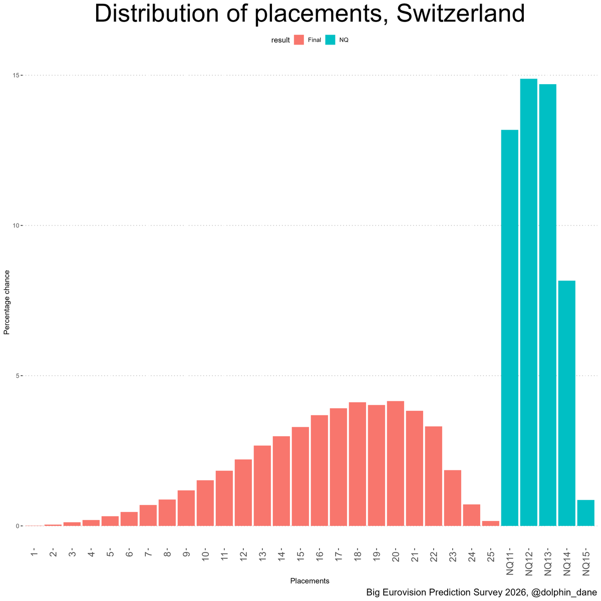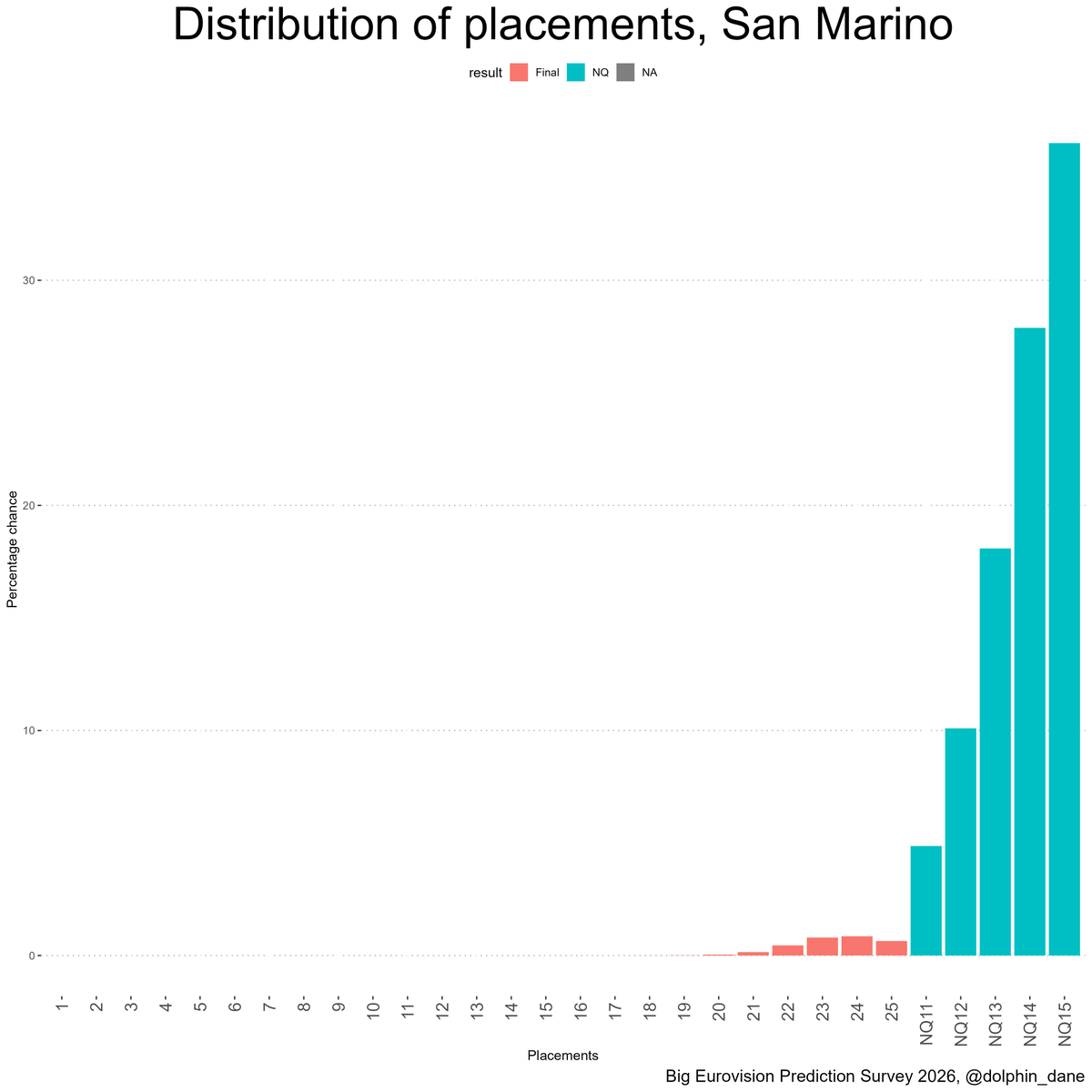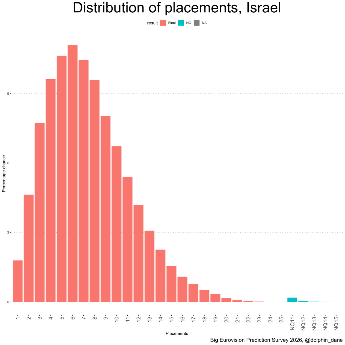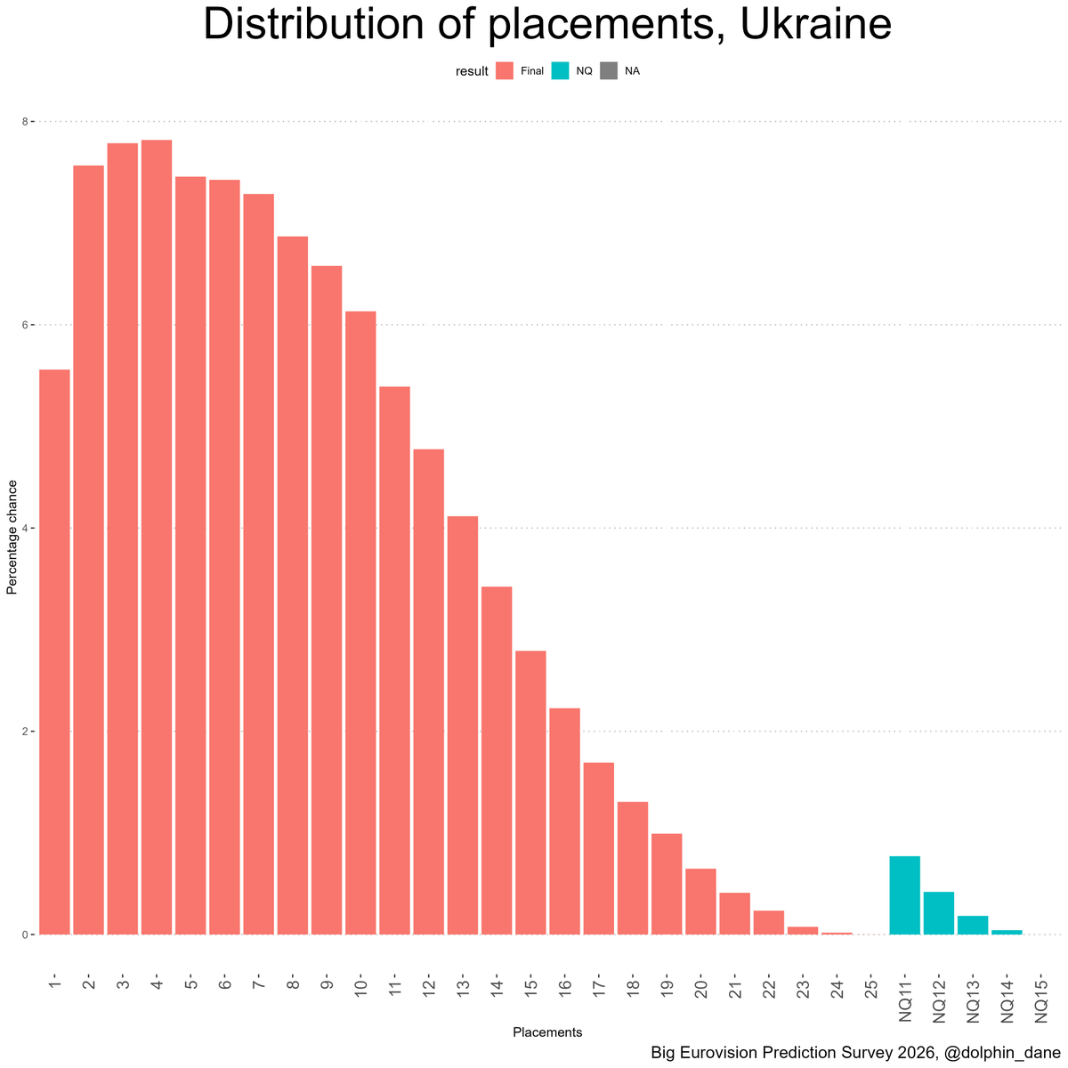 Let us now move on to a detailed country by country forecast. For each country I will show you the predictions that fed the model, as well as the distribution of placements for the entry in the 100000 simulations Image