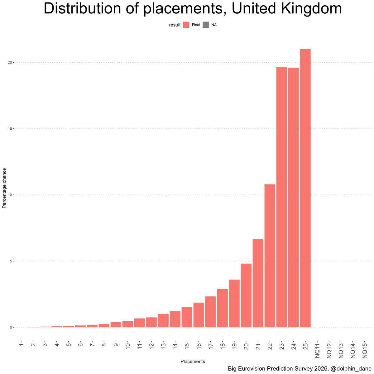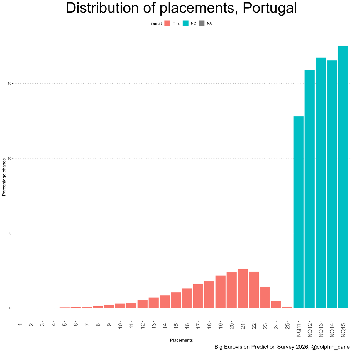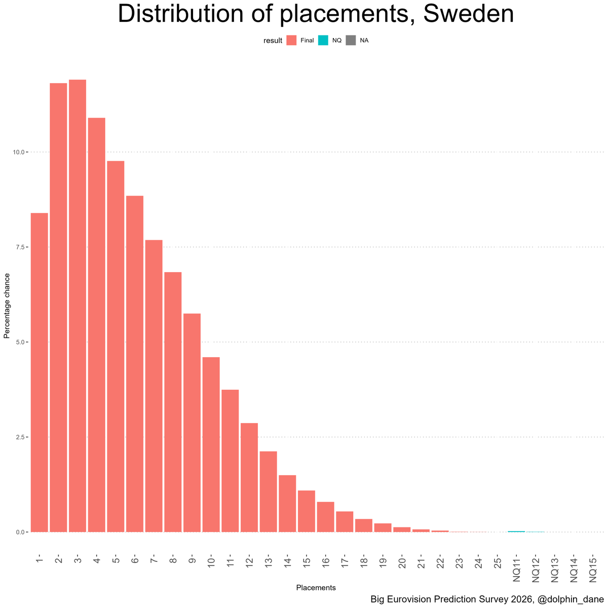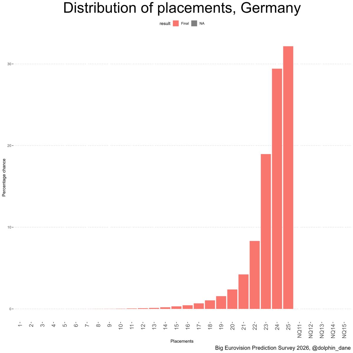 Let us now move on to a detailed country by country forecast. For each country I will show you the predictions that fed the model, as well as the distribution of placements for the entry in the 100000 simulations Image