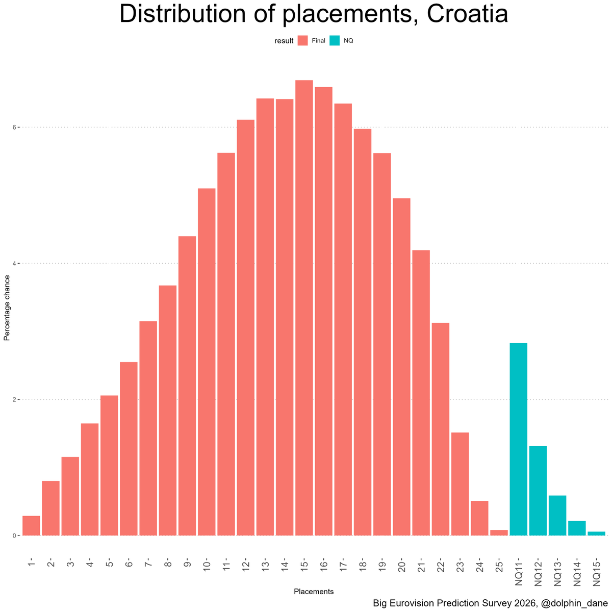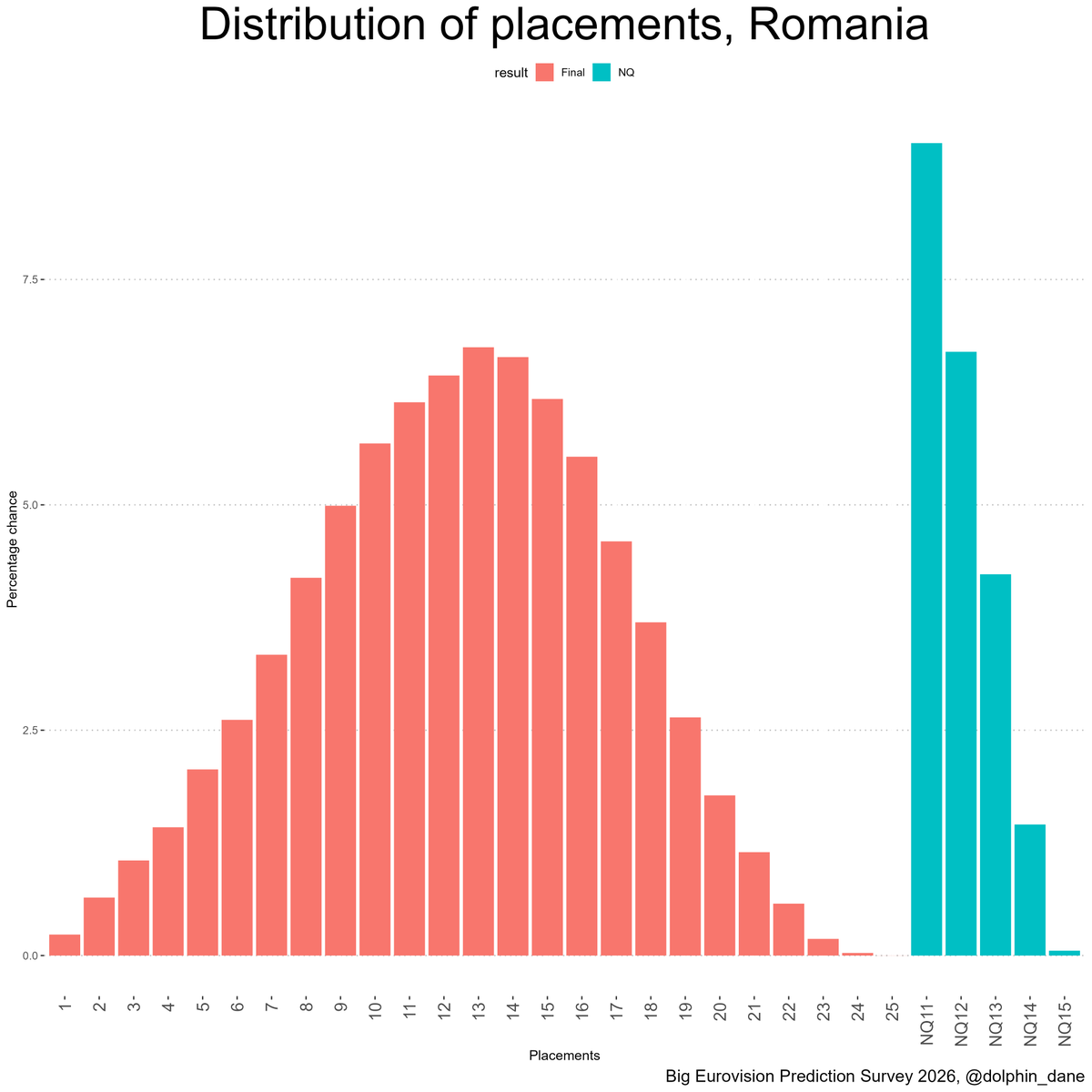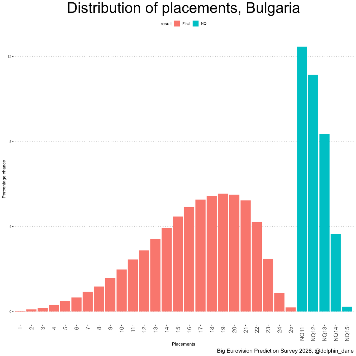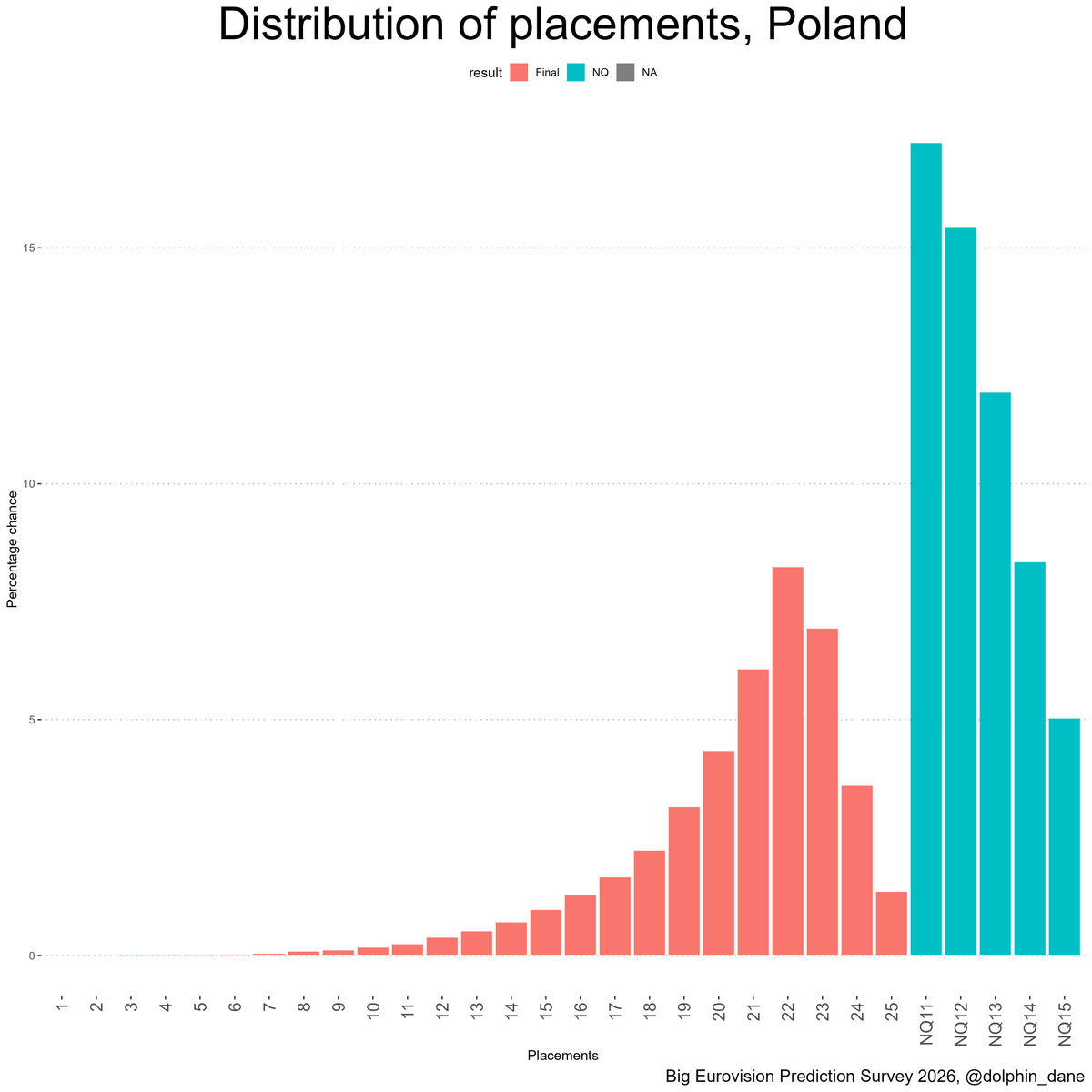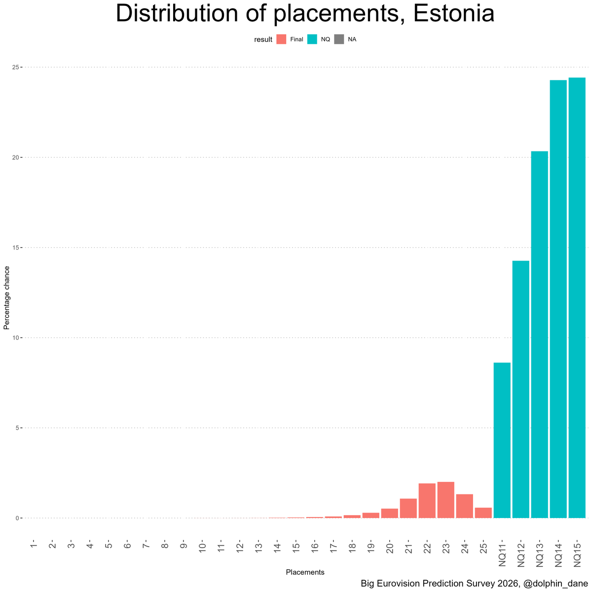 Let us now move on to a detailed country by country forecast. For each country I will show you the predictions that fed the model, as well as the distribution of placements for the entry in the 100000 simulations Image