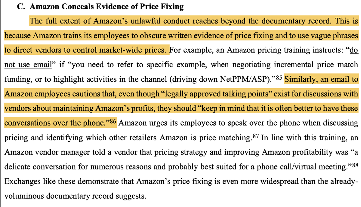 7. The email evidence is extensive, but it's almost certainly the tip of a much bigger price fixing operation. That's because Amazon trained employees to do this over the phone or to use "legally approved talking points."