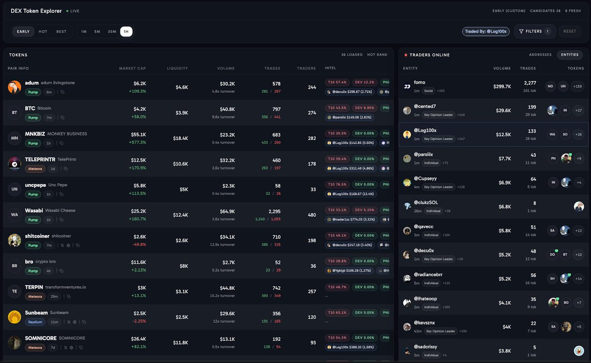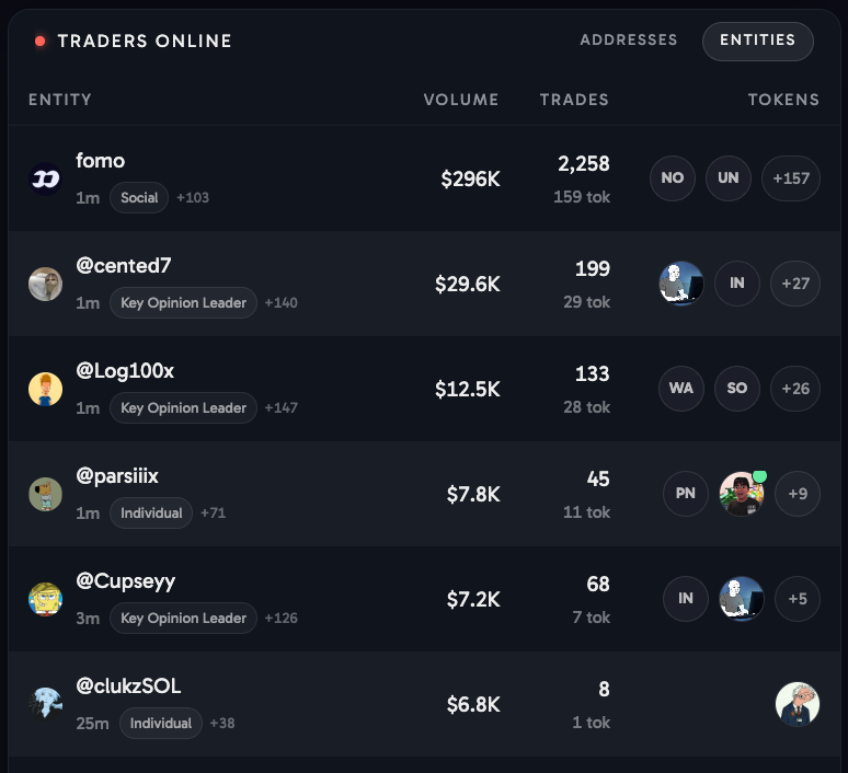> Click on any trader to see what tokens they’re buying or selling in real-time.
