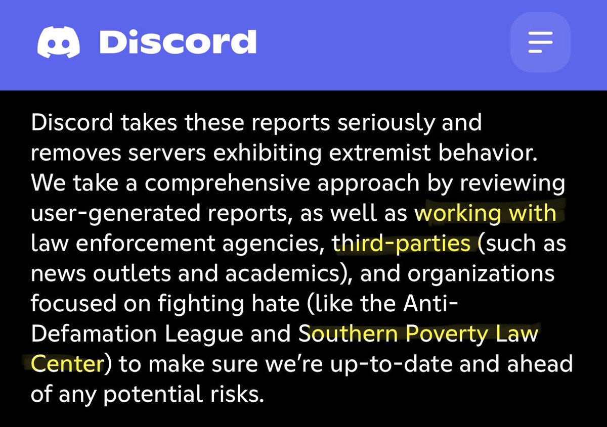 π¨π€― HOLY SH*T: Discord's own transparency reports/safety pages have referenced working with "organizations focused on fighting hate (like the Anti-Defamation League and Southern Poverty Law Center).β