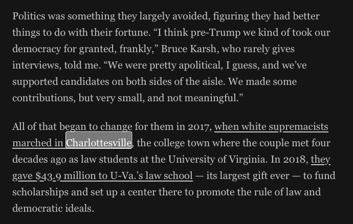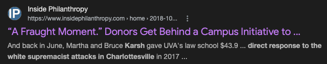 UVA Democracy Initiative (now Karsh Institute). $12.9M from 17 donors. "Direct response to the white supremacist attacks in Charlottesville."