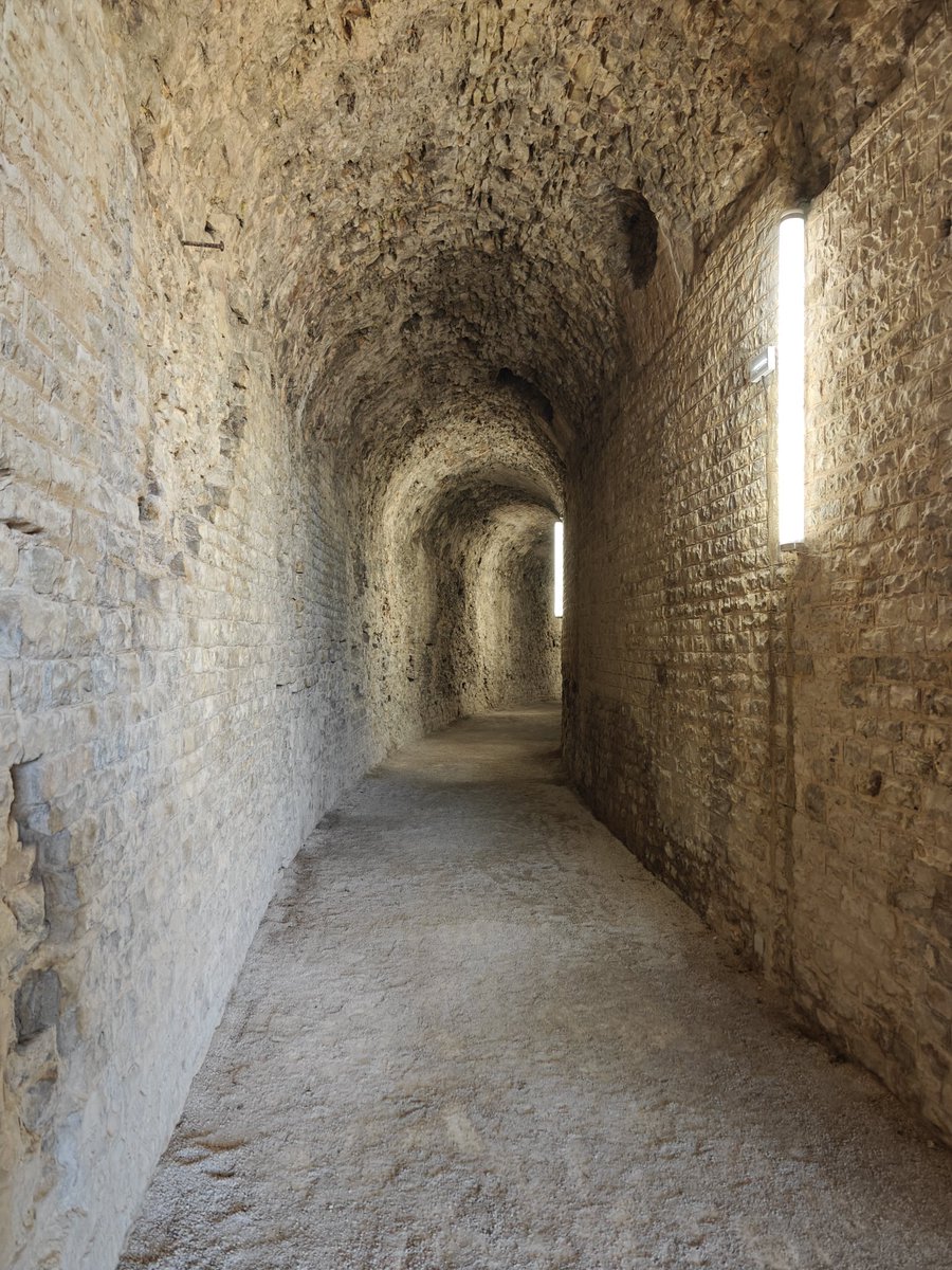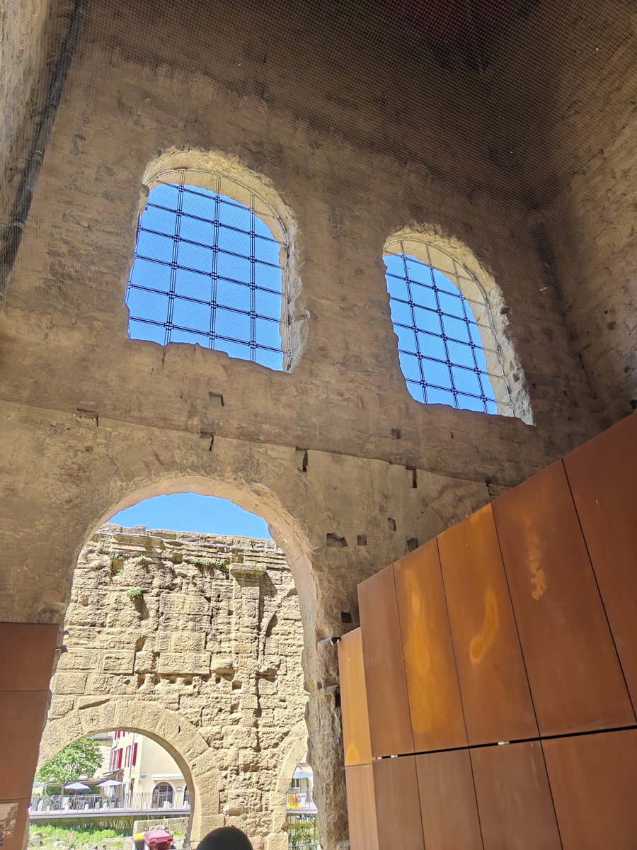 Amphitheatre (70-80 AD) - built slightly before the one in Nîmes both in the Flavian period. Arles still has some structural problems that are fixed in Nîmes. This includes the lack of a barrel vault but instead stone slabs that collapse because of the pressure on the galleries.