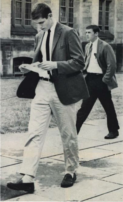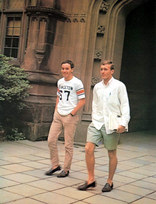 The loafer's popularity on campuses, especially elite institutions such as Harvard and Princeton, transformed this once rugged style derived from Norwegian peasant footwear into something more patrician. People typically wore them with "loafing" clothes (casualwear, sport coats)