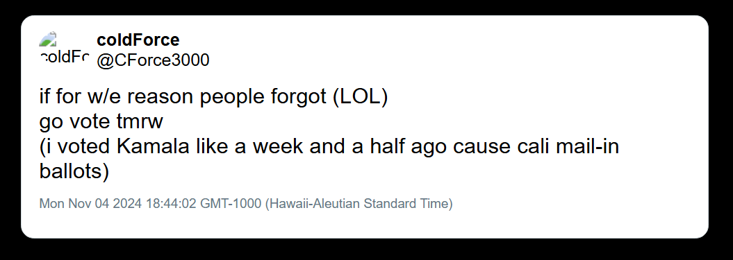 “Go vote tomorrow. I voted Kamala a week ago cause Cali mail-in ballots.”