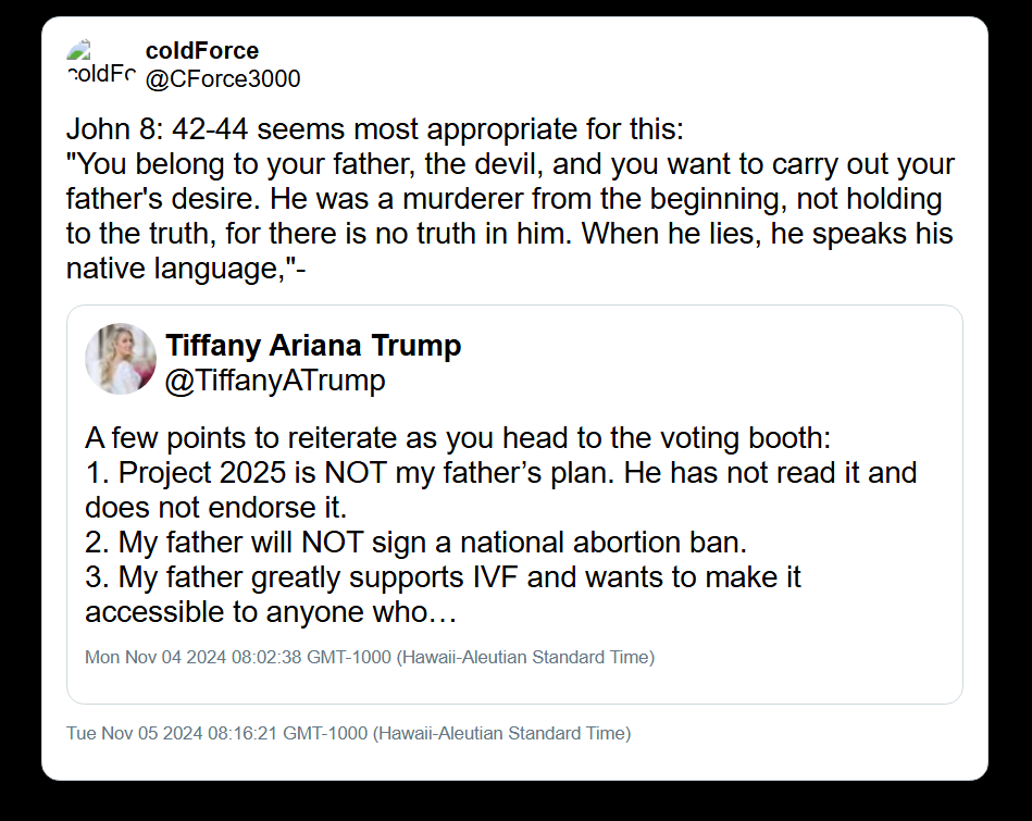 The next day, he quote-tweeted @TiffanyATrump's post about her father, Donald Trump, replying with a Bible verse: