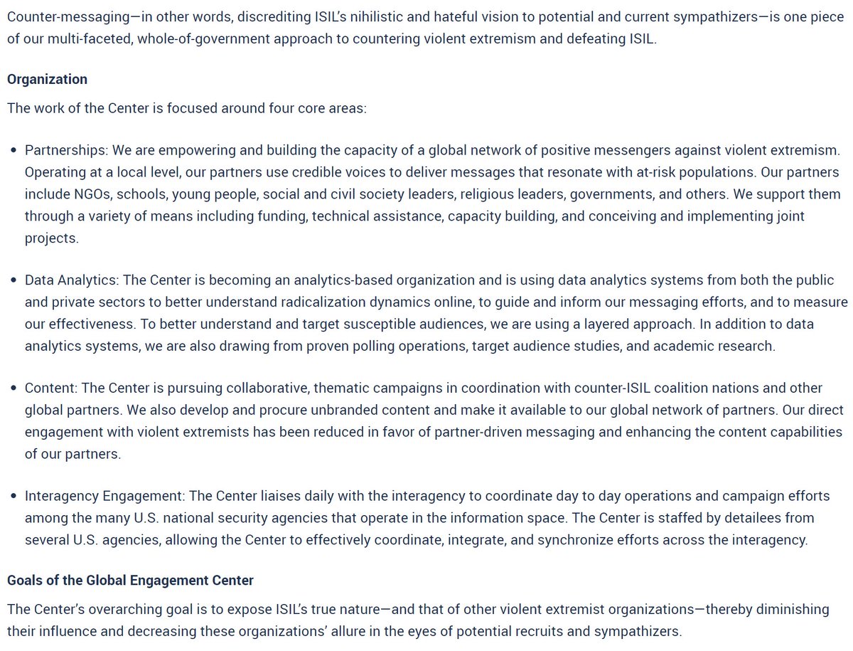 Note abt yesterday's Global Engagement Center media coverage: GEC evolved from CSCC to use data analytics & media against Daesh, not Russia
