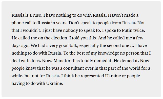 11/ If Manafort and Trump *ever* discussed Manafort being in contact with *any* Russians it proves Trump—see quote below—was covering it up: