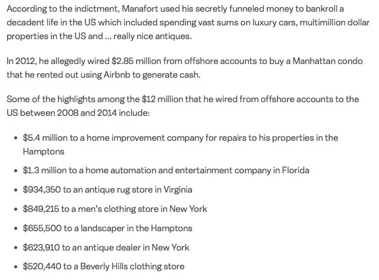 5/ Other charges are for money laundering and tax fraud. The indictment says Manafort laundered $18M+ since 2006. bit.ly/2z0FvwO