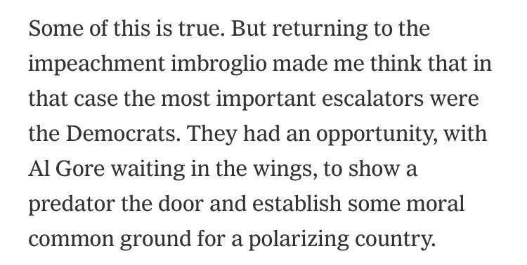 4/ In hindsight Douthat acknowledges that the partisan escalation was a product of Democrats choosing to be “an accessory to Clinton’s appetite”. That epiphany is particularly interesting in this moment. Will today’s Democrats make the same mistake with Hillary?