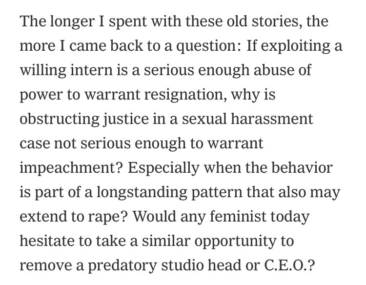 2/ This article by Ross Douthat is powerful in that it acknowledges the failure of Democrats to confront the scope of Bill’s crimes and how far he went to insulate himself from them. It’s not just that Bill should’ve resigned...