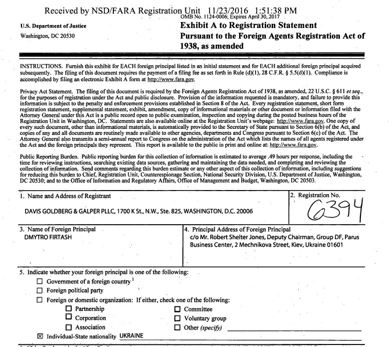 6- In November 2016, Davis and his law firm registered as a foreign agent acting on behalf & being paid by Firtash.