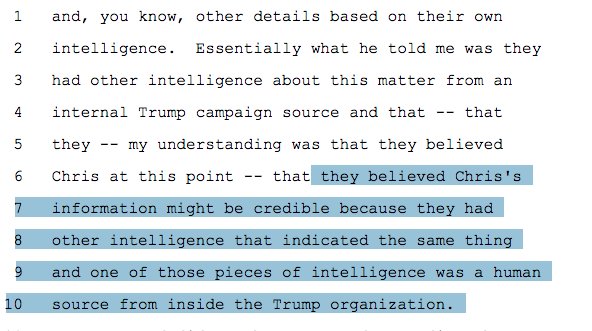 Steele said the FBI took him seriously because they already had information coming from someone "inside the Trump organization," according to Simpson