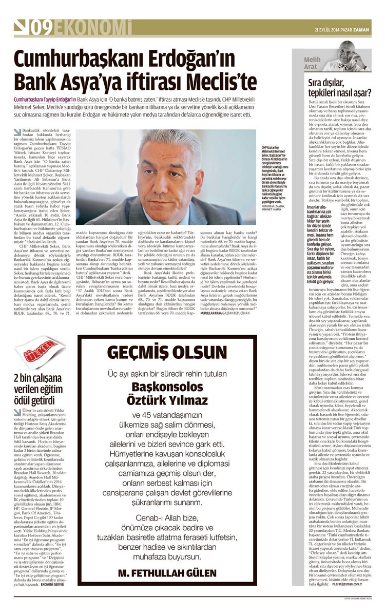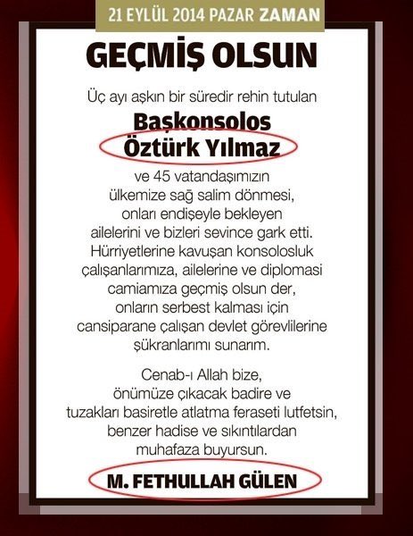 Öztürk Yılmaz'ın, 20 Eylül 2014'te serbest bırakılmasının ardından FETÖ'nün amiral gazetesi Zaman'da ilginç bir ilan yayımlandı. FETÖ elebaşısı Fetullah Gülen imzalı ilanda Öztürk Yılmaz için "Geçmiş Olsun" temennisinde bulunuldu