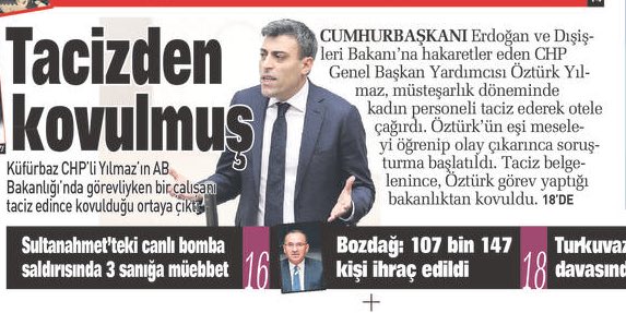 Öztürk Yılmaz AB Bakanlığı’nda müsteşar iken kadın personeli taciz ederek otele çağırdı. Öztürk’ün eşi meseleyi öğrenip olay çıkarınca soruşturma başlatıldı. Taciz belgelenince Öztürk görev yaptığı AB Bakanlığı’ndan kovuldu @ozturkyilmazCHP m.sabah.com.tr/gundem/2018/02…