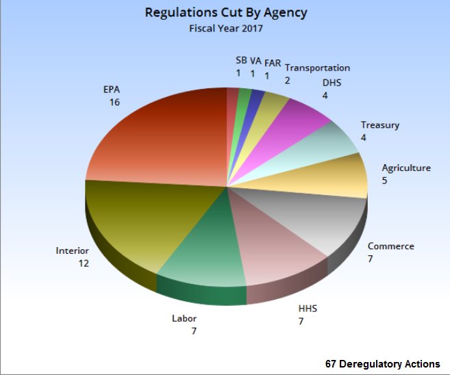 The Trump Admin cut 67 regulations with the EPA (16) and the Interior (12) leading the way. Here is an agency breakdown.