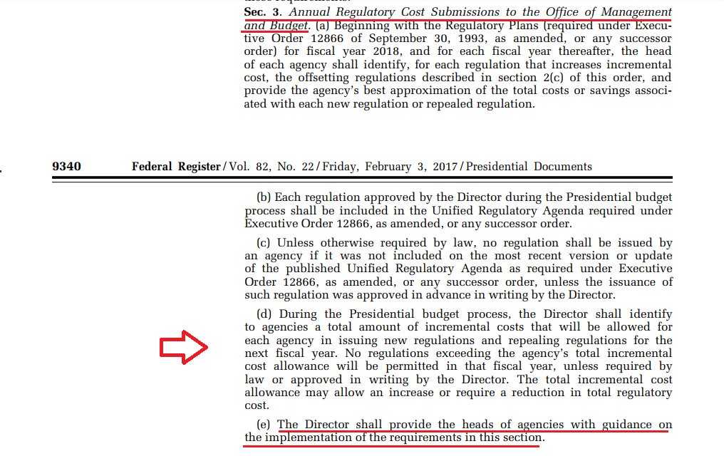 EO 13771 orders the Director of the Office of Management and Budget Mick Mulvaney to control regulatory costs. (Sections 2 and 3)