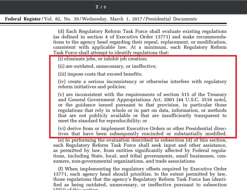 The RRO's and the task forces that they command are the agents of reform. EO 13777 orders them to use the following criteria to identify and eliminate regulations. (pg 2)