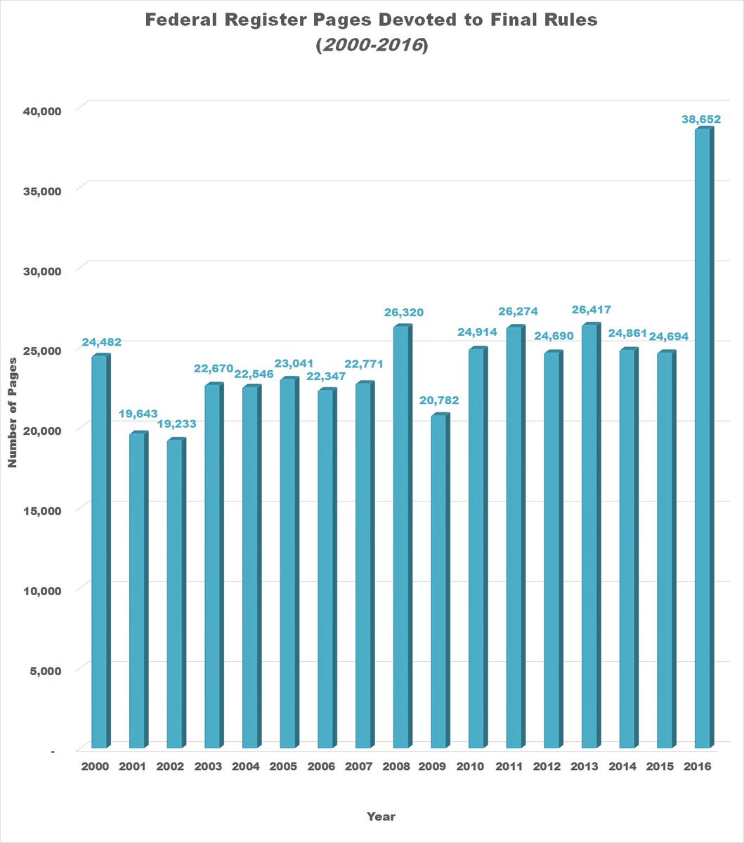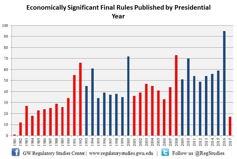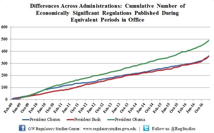 All three of Trump's predecessors enacted regulations that escalated over the course of their terms, with Obama shattering all records. This chart shows the ones of economic significance. They are a high priority for the reformers.
