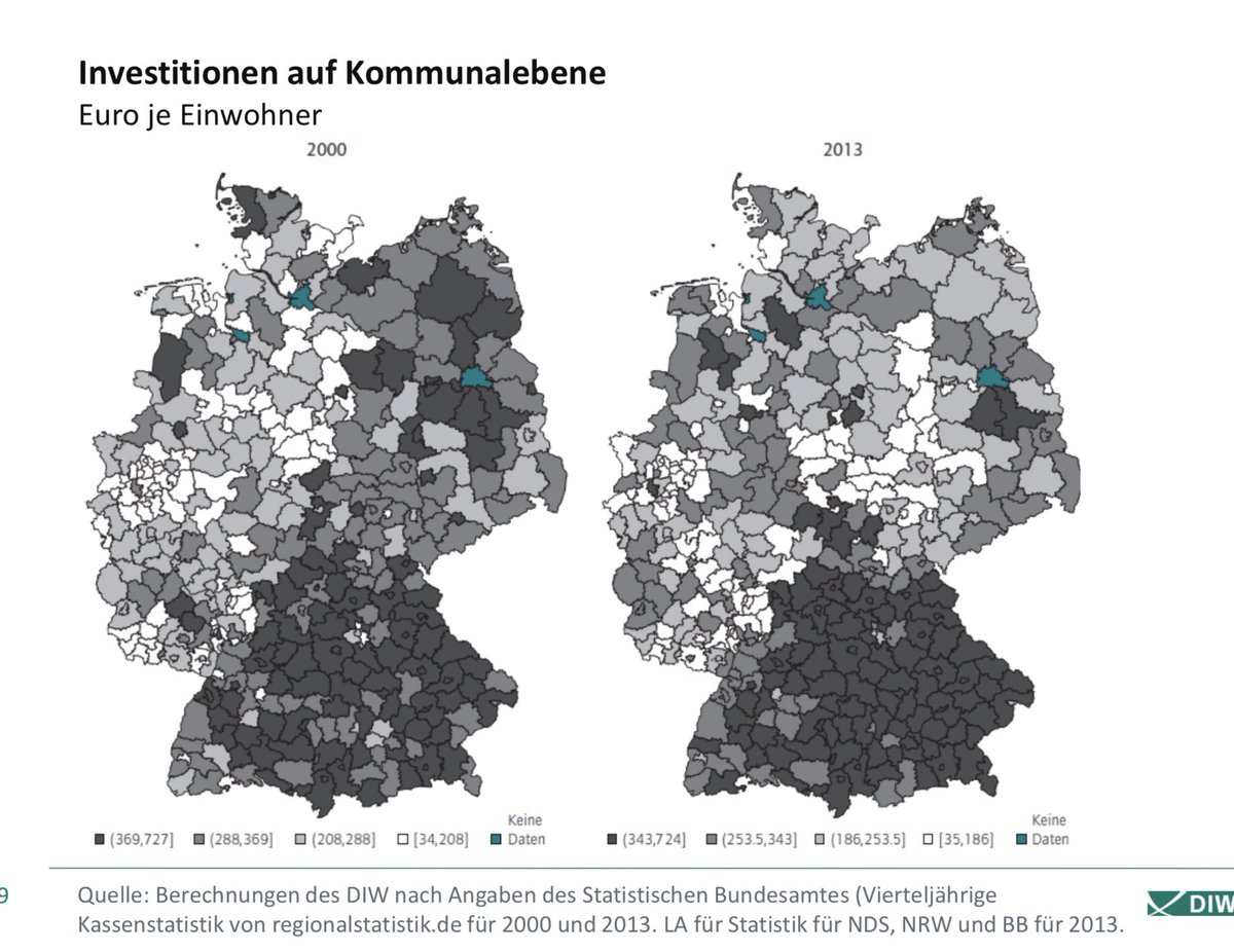 3/ Riesiges Süd-Nord Gefälle bei kommunalen Investitionen ist essentiell für steigende Ungleichheit der Lebensbedingungen in D. In vielen Kommunen verfällt die öffentliche Infrastruktur, da neue Investitionen noch nicht einmal den Wertverfall kompensieren. @DIW_Berlin Studie #in