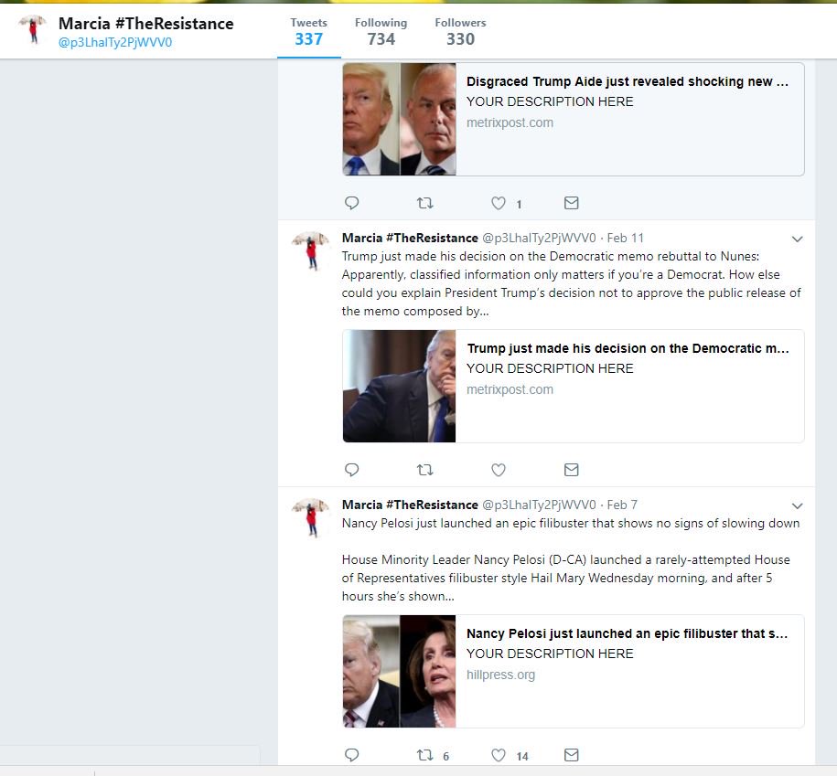 What these bots doing? well to guess we have to look at their history. This account started off with a tweet of another older bot from Oct then spent about two weeks retweeting big name resistance accounts. Honestly, at this point few could have guessed this was a bot.