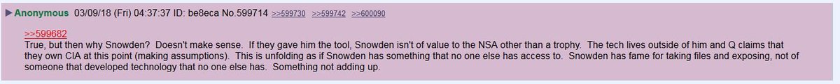True, but then why Snowden? Doesn't make sense. If they gave him the tool, Snowden isn't of value to the NSA other than a trophy. The tech lives outside of him and Q claims that they own CIA at this point (making assumptions). This is unfolding as if Snowden has...