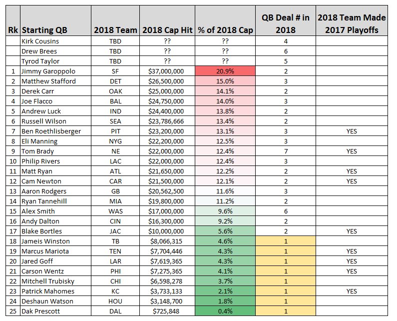 Here is a look at all 2018 cap hits and % of cap for the 28 projected starting QBs currently in the NFL, (along with QB deal #).