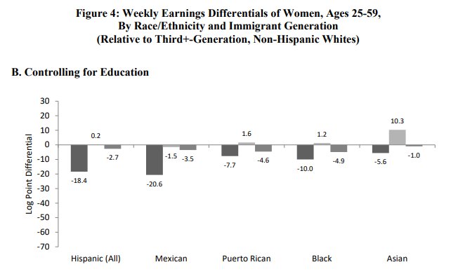 Notice that by the second generation, for all races, the earnings gap with white women (conditional on education) basically disappears by the second generation.
