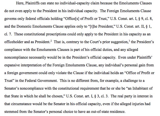 An update on the Emoluments Clause case against Trump in Maryland: Trump is now being sued in both his official and individual capacities. Today, Trump in his *official* capacity filed papers arguing why the *individual* capacity claim should be tossed assets.documentcloud.org/documents/4421…